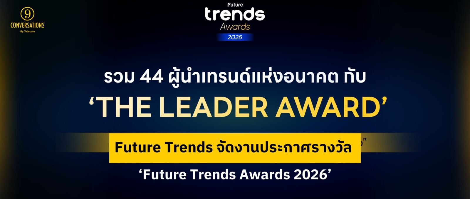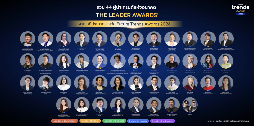 26 กุมภาพันธ์ 2026 Future Trends จัดงานประกาศรางวัล ‘Future Trends Awards 2026’ รางวัลสุดยอดผู้นำเทรนด์แห่งปี เพื่อประกาศและเชิดชูความสำเร็จขององค์กร แบรนด์ ผลิตภัณฑ์ และบุคคลที่มีความคิดริเริ่มสร้างสรรค์งานที่มีความโดดเด่น ซึ่งก่อให้เกิดคุณค่าสูงสุดต่อสังคมเป็นวงกว้าง